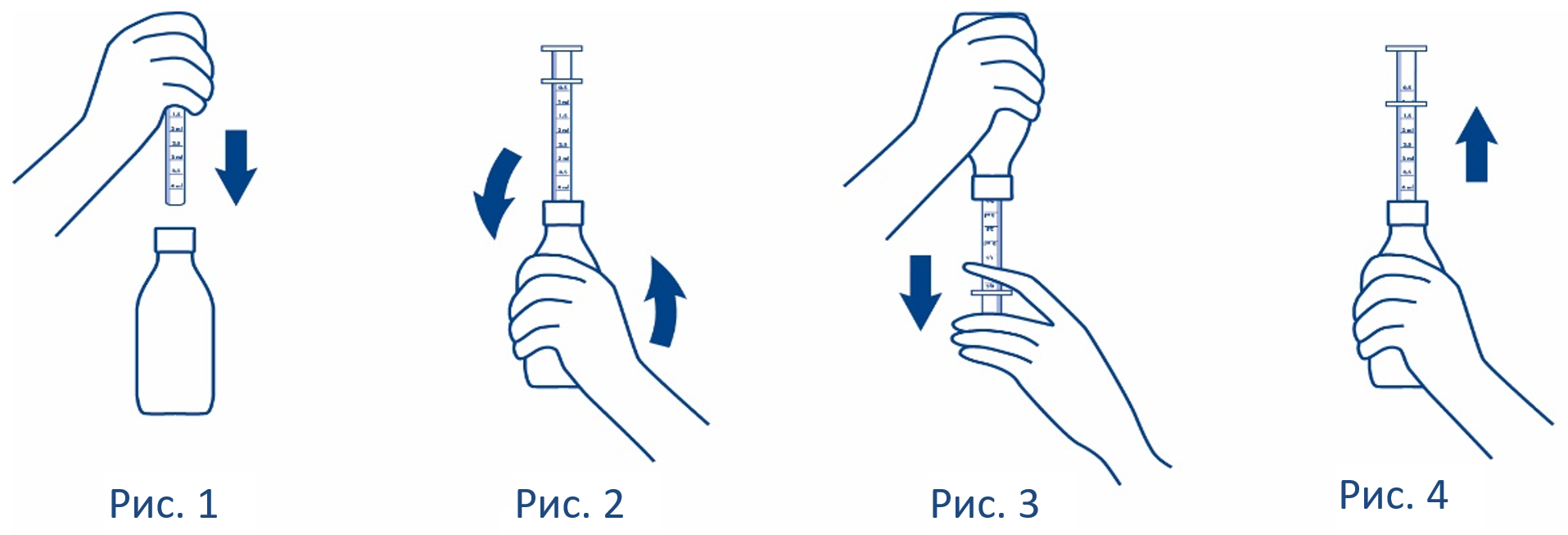 - После набора необходимого количества препарата, верните флакон в исходное положение и извлеките шприц из флакона, осторожно вывинтив его из отверстия в горлышке флакона (Рис. 4).